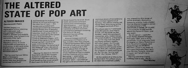 In February 1982, Paul Morley reviewed live concerts by three groups across three weeks - Haircut 100, Altered Images, Depeche Mode. Groups generally deemed among the flimsiest of the New Pop offerings of the time. The review trilogy was aimed as a series of goads goring the sober-sides of aging Clash fans and grey overcoats still mourning Joy Division. It's a tour de force of provocative - and genuinely thought-provoking - transvaluation, celebrating surface pleasures, frivolity, disposability, while gleefully rubbishing ideas of substance, seriousness and durability. Note the appearance of the word "post-rock" in these reviews, meaning something quite different from what it would in the '90s.